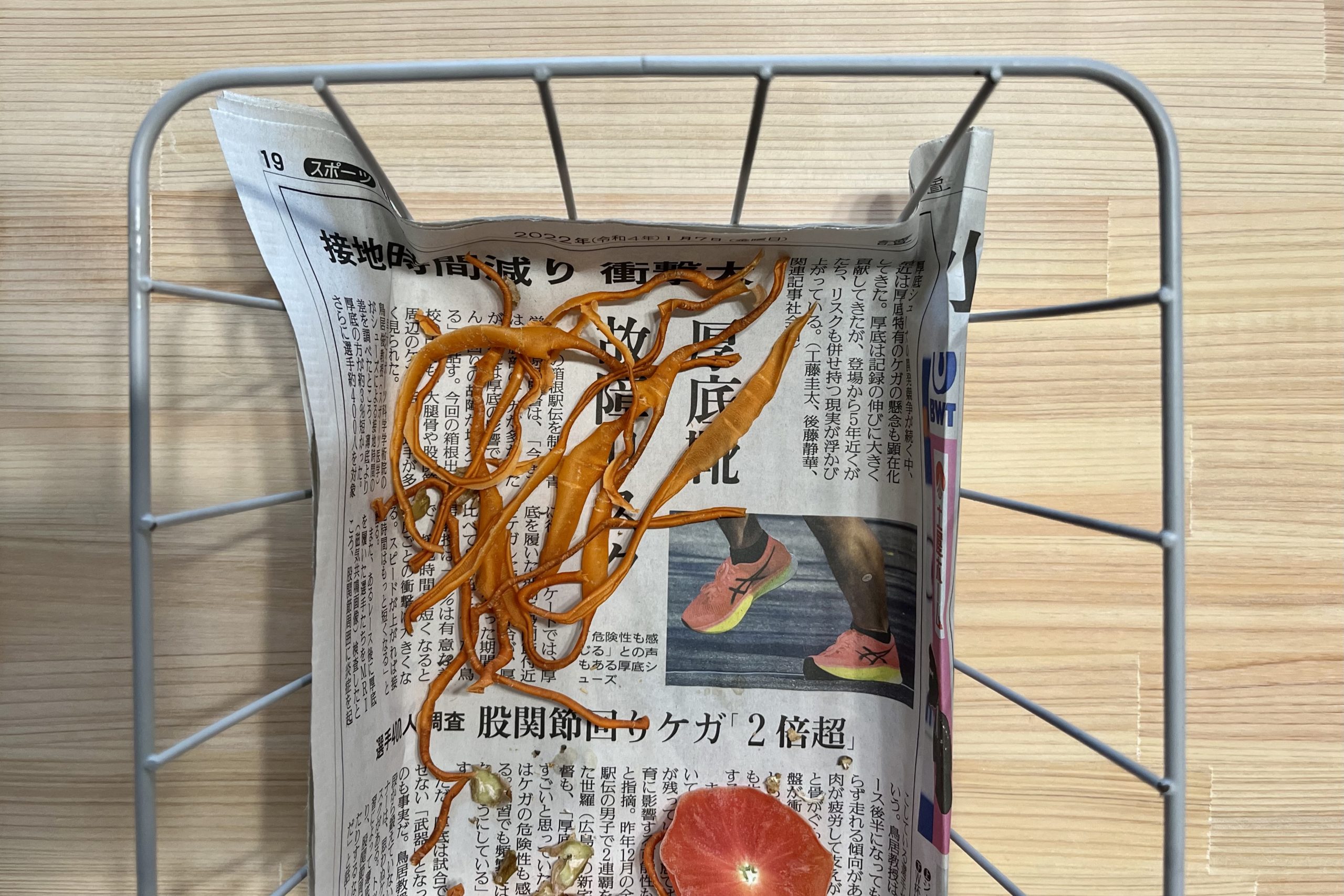 生ゴミを乾燥させるには、風通しがいいカゴに新聞紙をしいて、ベランダや風通しのいい窓際で干すだけです。