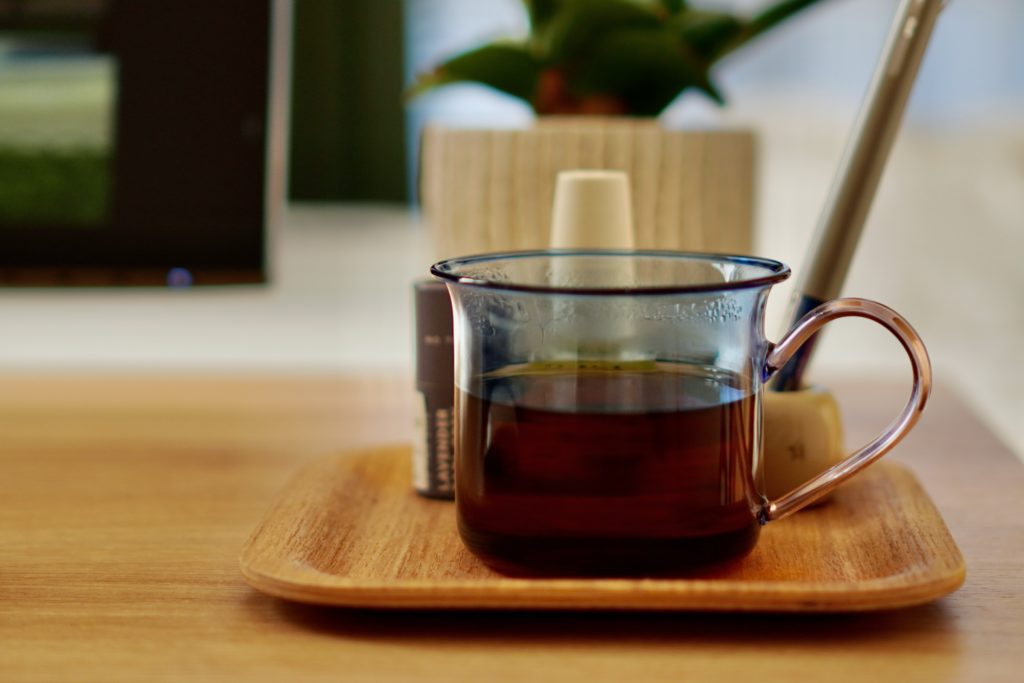 以前、デスクの上の小物がごちゃつくのでデスク上の収納を買おうか考えましたが、来客用に買ってあった大きめのコースターで代用しました。